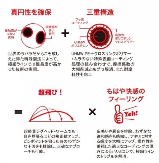 スーパーハイテクファイバーUHMWPEにムラの無いコーティング処理を施し、強度の安定感を確保。糸鳴り、異音、違和感を排除し、わずかな変化も伝える究極感度を実現。