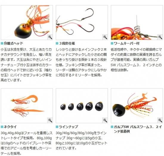 デビル渡辺考案 音でアピールする新発想タイラバ! 隠し玉と喰わせ玉の2つの分離式タイラバ。小さい喰わせ玉が、水流でアクションし、音や派手な色合いで喰い気を誘う新しいタイプのタイラバです。