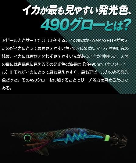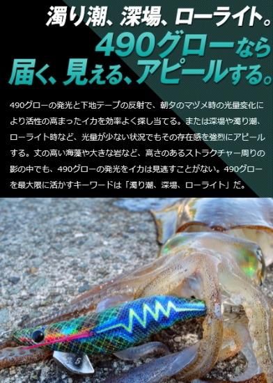 YAMASHITA独自の徹底した生態研究によりイカが喜ぶラトル音を解明し、音で強烈にイカを誘い出してきたエギ王 Q LIVE サーチ。今回、高活性のイカを狙い撃つサーチ能力をさらに高めるために、YAMASHITAが着目したのは視覚。そして、生態研究によりイカが見やすい 発光色を開発した。その新しいアピール要素をプラスし、よりサーチ能力を高めたのが490グローカラーだ。