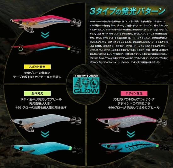 YAMASHITAの徹底的な生態研究に基づいた素材開発、生態波動論により生まれた、 イカかが見やすい発光色「490 グロー」。光量の少ない時、夕マスズメ、朝マスズメのプライムタイムにアングラーの第一投目の効果をより高めたいというという想いから「エギ王Q LIVE サーチ 490 グロー」が生まれた。多くのアングラーにその効果を支持され、さらに「490 グロー」を音の有無でローテーションしたい、全体夜光が欲しいといったアングラーの声をカタチにするため、更に進化した発光パターンをエギ王Q LIVE に搭載。