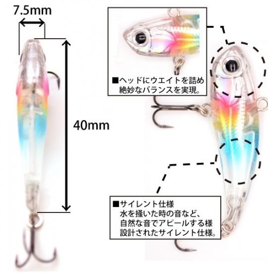 ■バイブレーション 一口サイズの40mmのフォルムで、バイブレーション特有のプルプルとしたアクションを可能にした『ナイトミノー バイブレーション』。 一定のタナを攻めたい時に最適。