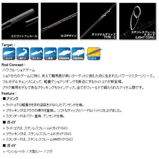 小〜中型青物をターゲットとした、取り回しの良いレングスのライトショア・ジギングロッド。 やや軽めの40g程のメタルジグやプラグとの相性が高く、足場の低い防波堤や磯場から砂浜などで活躍します。