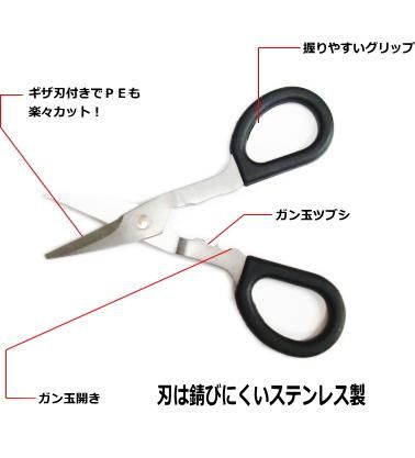ライン切りやガン玉の取り付け、外しなどが簡単にこれ一個で作業できる便利なハサミ。