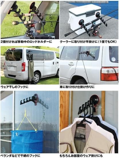 車内に2個取り付れば移動中のロッドホルダーに!クーラーに取り付けて竿掛けに!ウェア干しのフックに!