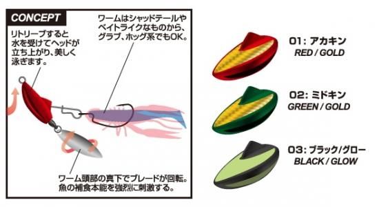 リトリーブすると水を受けてヘッドを少し立ち上げブレードを回転させながら美しく泳ぎます。そのフラッシング効果で魚の捕食本能を強烈に刺激。また、全方向に対してフックの自由度が高いのでスイミングに限らず、ボトムステイ時もワームの動きを妨げません。シャッドテールやベイト系のものからグラブ、ホッグ系ワームでもOK。