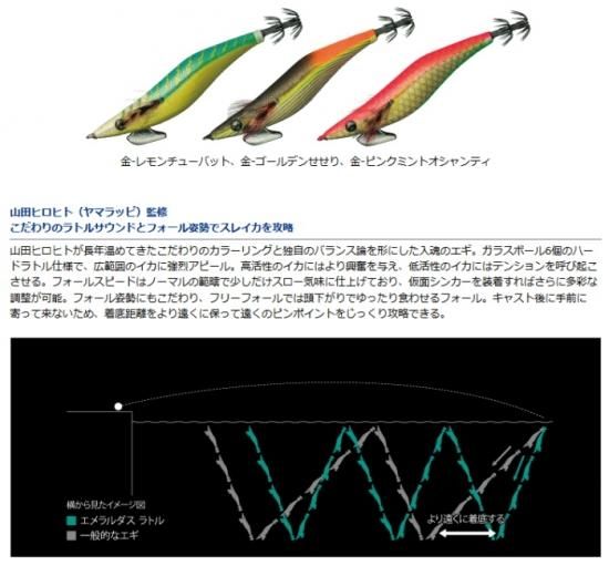 山田ヒロヒトが長年温めてきたこだわりのカラーリングと独自のバランス論を形にした入魂のエギ。ガラスボール6個のハードラトル仕様で、広範囲のイカに強烈アピール。高活性のイカにはより興奮を与え、低活性のイカにはテンションを呼び起こさせる。フォールスピードはノーマルの範疇で少しだけスロー気味に仕上げており、仮面シンカーを装着すればさらに多彩な調整が可能。フォール姿勢にもこだわり、フリーフォールでは頭下がりでゆったり食わせるフォール。キャスト後に手前に寄って来ないため、着底距離をより遠くに保って遠くのピンポイントをじっくり攻略できる。