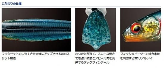 その独特の形状は水つかみが良く、振り子状に左右にスイングするため、ソフト素材と相まってボディ全体がウォブル&ロールアクションを引き起こし、波動と3Dリアルアイ&フィッシュフレーバーが生み出すリアルな外観との両面からアピール。背中側にはフックセットの目安となるスリット入り。ヒラメ・マゴチ狙いのフラットゲームのみならず、シーバス・ロックフィッシュ・バス等あらゆるルアーゲームでマルチに活躍する。