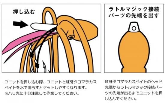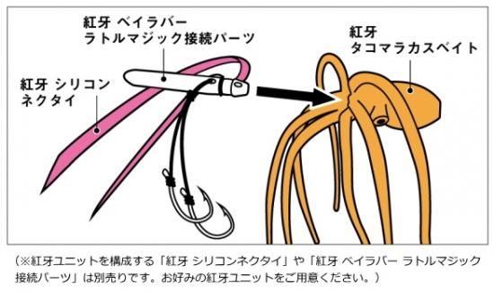「紅牙 タコマラカスベイト」は、マダイのメインベイトの一つであるイイダコや小型イカをイミテートし、マダイが好む甲殻類のエキスを配合した高強度スーパーソフトマテリアル製のタコベイト。「紅牙 ベイラバーラトルマジック接続パーツ」にお好きなネクタイと組み合わせてセットすれば自分だけの爆釣タイラバが完成。レッグには張りを持たせているためフックやレッグ同士の絡みも少なく、快適な釣りを楽しめる。