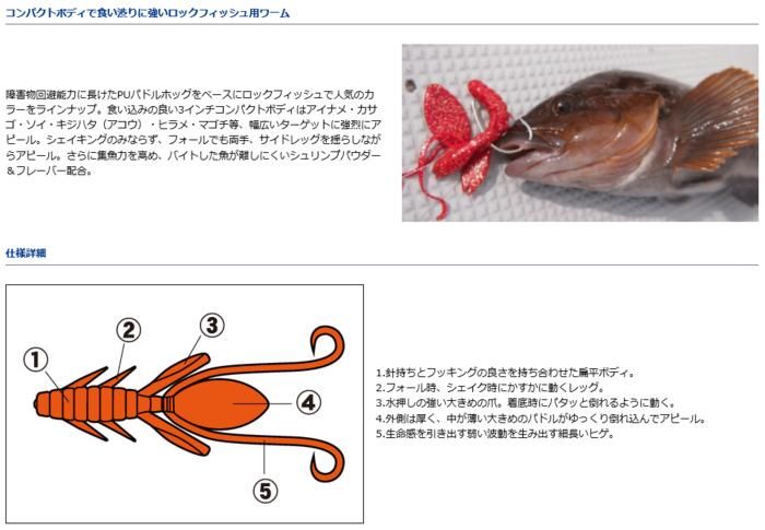 障害物回避能力に長けたPUパドルホッグをベースにロックフィッシュで人気のカラーをラインナップ。食い込みの良い3インチコンパクトボディはアイナメ・カサゴ・ソイ・キジハタ(アコウ)・ヒラメ・マゴチ等、幅広いターゲットに強烈にアピール。シェイキングのみならず、フォールでも両手、サイドレッグを揺らしながらアピール。さらに集魚力を高め、バイトした魚が離しにくいシュリンプパウダー&フレーバー配合。