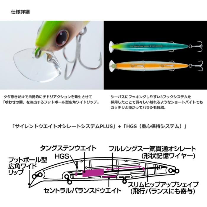 オープンエリアにいるシーバスを「誘き寄せて釣る」ことをコンセプトに開発されたハイアピールシンキングミノー。タダ巻きひとつでオープンエリアでも遠くから魚を誘き寄せる。しかも水平姿勢で泳ぐためスレた活性の低い居着きシーバスにも口を使わせる。「ショアラインシャイナーZセットアッパー125SDR」譲りの空気抵抗を抑えたボディ形状と、「ぶっ飛びサイレントウエイトオシレートシステムPLUS」との相乗効果で、Max73.5m(当社テスト)という驚きの飛距離を生み出す。