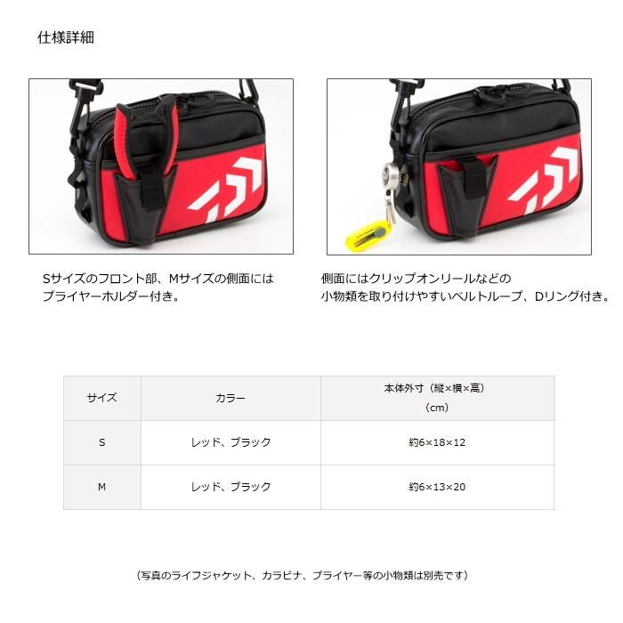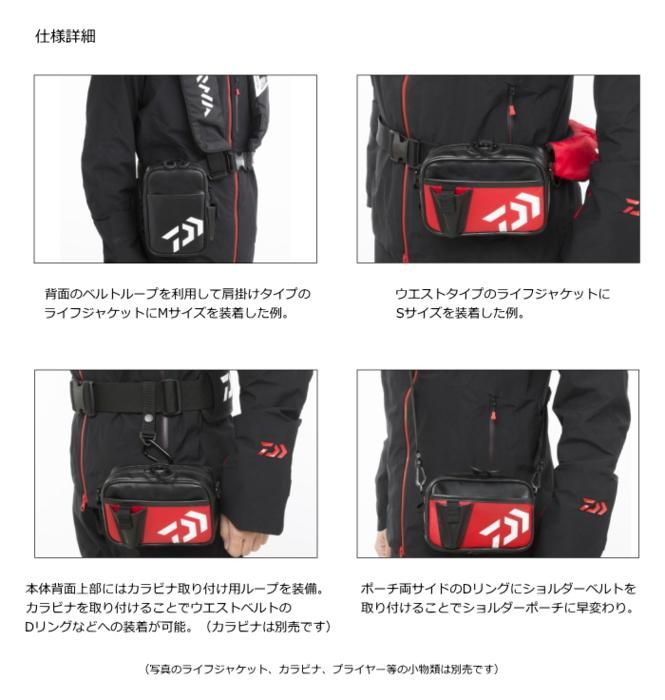 収納部や小物取り付けスペースが少ないライフジャケットに取り付け可能なマルチポーチ。背面ベルトループ、カラビナ取り付け用ループ、ショルダーベルト装備で3通りの使い方が可能。汚れ・水に強いPVCターポリン素材で、S・Mサイズ共にサッと取り出したい物の収納に便利なフロントポケット、プライヤーホルダー付き。