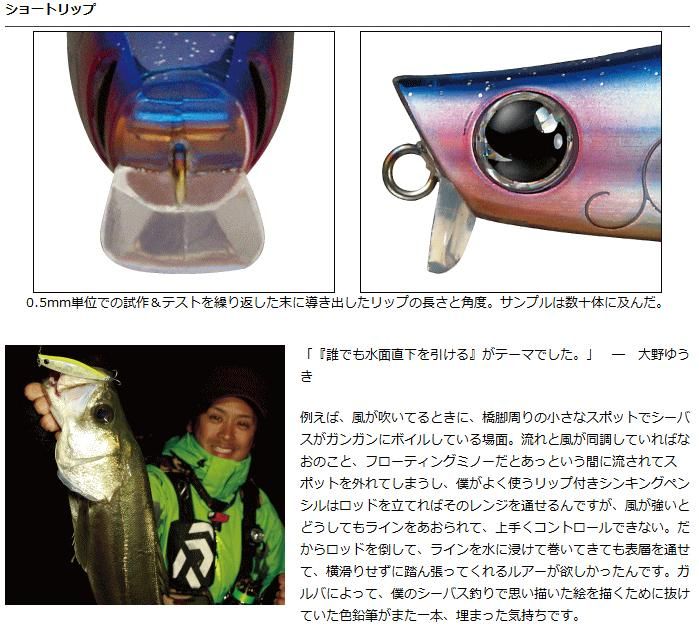 大野ゆうき完全監修によるリップ付きシンキングペンシル。ターゲットレンジは水面直下から水面下約20cm。数多の試作を繰り返した末、絶妙の長さと角度で設計されたショートリップを装備したことで、素早い浮上性能とレンジキープ性能を両立。そのパラシュート効果により風のある状況でも上ずりと横滑りを軽減し、誰でも水面直下をイージーにトレース可能。また固定ウエイトながらキャスタビリティは秀逸。さらにスレさせにくいスローピッチアクションで激戦区の湾奥ゲームに最適。