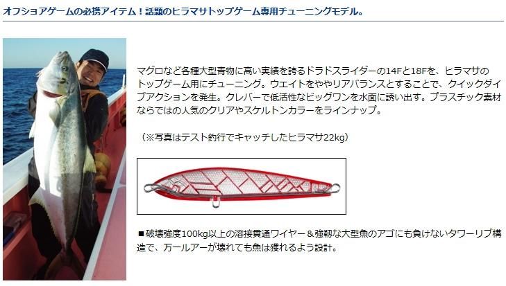 マグロなど各種大型青物に高い実績を誇るドラドスライダーの14Fと18Fを、ヒラマサのトップゲーム用にチューニング。ウエイトをややリアバランスとすることで、クイックダイブアクションを発生。クレバーで低活性なビッグワンを水面に誘い出す。プラスチック素材ならではの人気のクリアやスケルトンカラーをラインナップ。