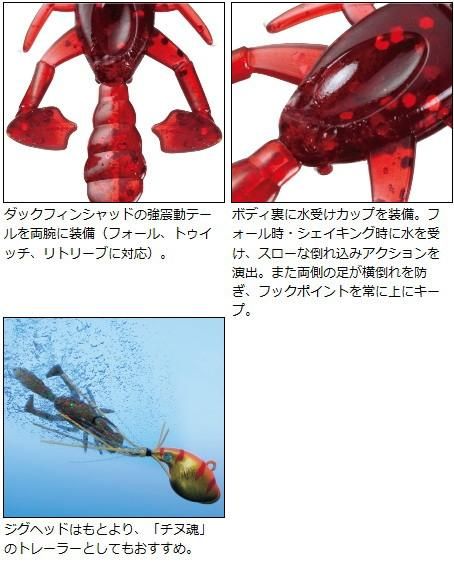 ダックフィンシャッドから引き継いだハイレスポンスアームがフォール時やリトリーブ時に高波動を発生させてチヌに強力アピール。シェイキング、リフト&フォールでは、スプリットカットが可能なパドルテールが大きく水を押してチヌはもちろん、カサゴやムラソイなどの根魚も魅了。さらにバイトを誘うシュリンプフレーバー配合。
