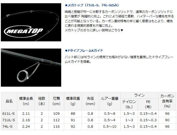 アジングのメインステージのひとつである漁港の常夜灯周りで抜群の強さを誇るジグヘッド単体使用での「縦の釣り」を得意とした掛け調子の攻撃的モデル。ティップセクションにはハイパフォーマンスカーボンソリッドを配し、フォール中のテンション抜けのアタリも確実にキャッチ。