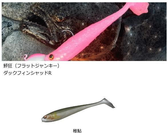 リトリーブ、リフト&フォール、ジグヘッド、キャロライナリグとあらゆるメソッド、リグに対応するフラットゲーム万能シャッドワーム。ベイトフィッシュそっくり且つ食べごろ感たっぷりのボディに水鳥の足ヒレ形状からヒントを得た「ダックフィンテール」を搭載。