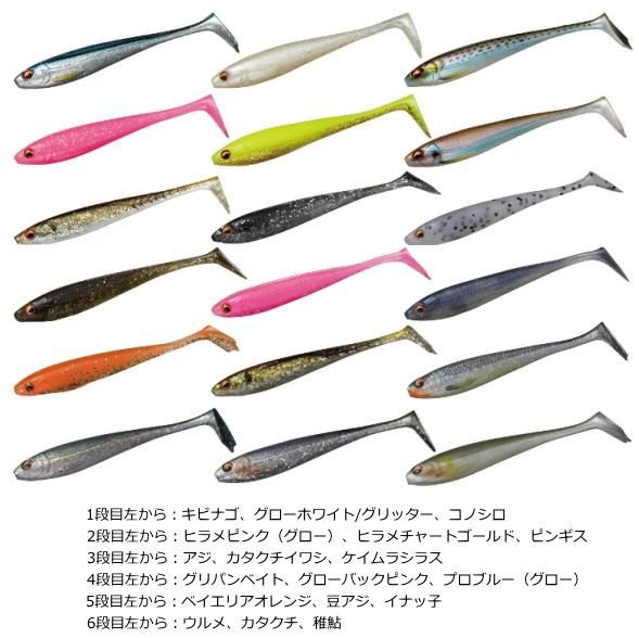 その独特の形状は水つかみが良く、振り子状に左右にスイングするため、ソフト素材と相まってボディ全体がウォブル&ロールアクションを引き起こし、波動と3Dリアルアイ&フィッシュフレーバーが生み出すリアルな外観との両面からアピール。背中側にはフックセットの目安となるスリット入り。ヒラメ・マゴチ狙いのフラットゲームのみならず、シーバス・ロックフィッシュ・バス等あらゆるルアーゲームでマルチに活躍する。