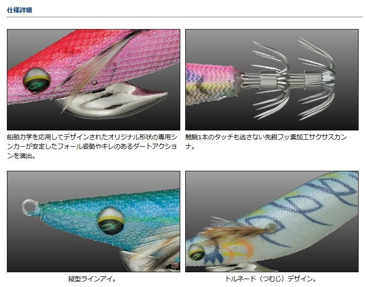 シーンを問わず活躍する大定番エギ「エメラルダスダート」の性能を継承し、実績のカラーを厳選してブラッシュアップ。驚異の貫通力で様々な釣りにおいて高い実績をあげているSaqSas(サクサス)加工によるカンナ、船舶力学の応用から生まれた独自形状の「ハイスキュードシンカー」、よりシャープなノーズ形状、縦型ラインアイを搭載し、オールマイティ性能にさらに磨きがかかったエギングシーンの新たなるスタンダード。