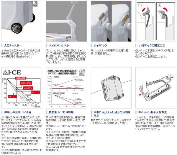 最 大60cmの魚を曲げずにまっすぐ収納できる6面真空パネル採用によりI-CE値65hという非常に高い保冷力を誇ります。ワンアクションでフタが開閉で きるラックトップレバーはロック操作不要の便利機能です。満タン時の持ち運びも楽々の大型キャスター&ラックアップハンドル付き。
