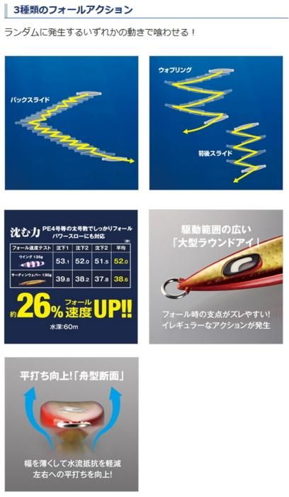 目指したのは単にスローフォールするジグでは無く、その中に複数の「喰わせの要素」を混ぜ込む事。サーディンウェバーは大きく分けて3種のフォールアクションを出す事が可能。1つはバックスライド。2つ目はクイックな切り換えしが入るウォブリングフォール。3つ目には前後スライド。この3種のアクションがランダムに入る事で、ジグは“捕食者から逃避するベイト”を演出する。オートマチックにジグが仕事をしてくれるので、初心者からマニアまで、幅広く使いやすい。開発はセンターサーディンをベースとし、フロントをやや絞ったサイドフラット形状を採用。ジャーク時の抜け感が軽く、青物に効くスピードを活かしたアクション変化が出しやすい。スティンガーバタフライウイングと比較し沈下速度も速いため、テンポ良いフォールの釣りを組み立てる事ができる。