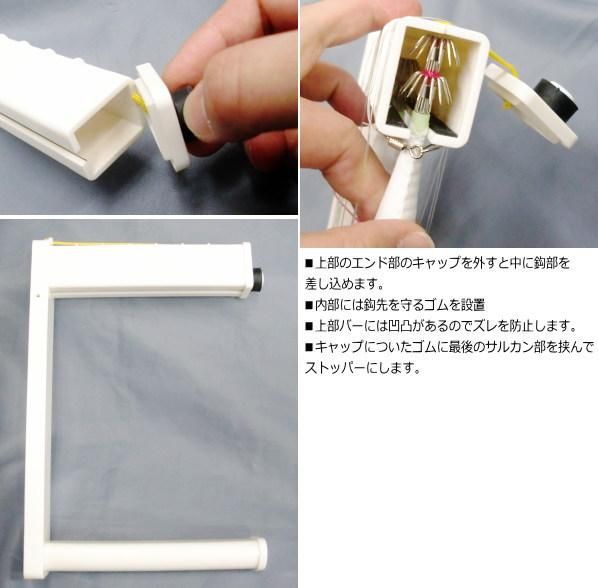 作ったスッテ仕掛けをそのまま絡まずに収納する仕掛巻き。上下のバーに巻きつけながらスッテを上部バーの内部に鈎を差し込みながら収納します。