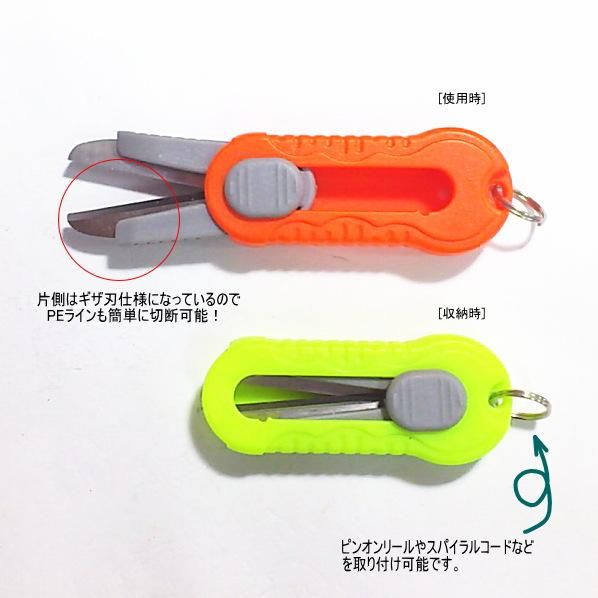 刃の片側はギザ刃仕様になっており、PEラインも楽にカットできます。エンド部にはリングを装備しているので、ピンオンリールやホルダー等を取り付けてバッグやベルト部、ベストなどに取り付けも可能!使いたいときにサッと手にできます。