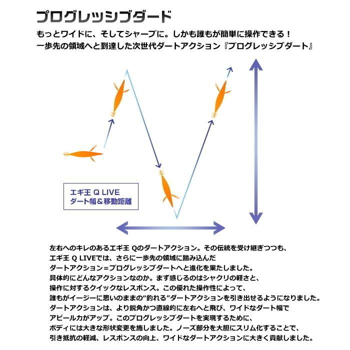 その結晶ともいえるエギこそがエギ王 Q LIVEです。ノーズをスリム化することでシャクリ抵抗の軽減とクイックレスポンスを実現。誰でも軽い力で思い通りのダートアクションが引き出せるようになりました。また、それによってダートアクションも、より鋭角的に切れ込んで直線的かつワイドに左右へと飛ぶ“プログレッシブダート”へと進化しています。さらに跳ね上がりも強化。より高く舞い上がることで、アピール力を増すと同時にフォール時間も伸ばしています。