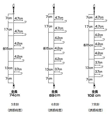 「誘惑段差」シリーズの注目すべき点は、ハリスの長さです。上段4.7cm・中段4.2cm・下段3.7cmとなっています。この段差システムにより、誘いを掛けるとハリスの動きが不規則となり、食い渋ったワカサギを誘惑し食わせます。また、仕掛け上のハリ大きなアタリが出やすく、仕掛け下のハリほどアタリが小さくなりやすいが、この段差システムは上から下まで同じようにアタリが出るようハリスの長さを考え設計しました。これにより、小さなアタリから大きなアタリまで違和感なくアタリを捕らえる事が可能となりました。仕掛けの長さも3種類。狭いドーム船や、屋形船は5本74cmと、6本89cmがオススメです。ボート釣りや氷上の広いテント内では7本102cmで攻めると良いでしょう。