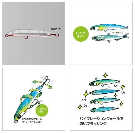 ベイトライクで良く飛ぶコンパクトな100mmボディにタフな貫通ワイヤーを搭載。泳ぎはワイドウォブンロールとフォーリングバイブレーションを発生するウェイトバランスでしっかりと魚にアピールします。