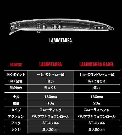 表層流を確実に掴むハイレスポンスな設計を施し、ルアーの動きはその流れに乗せるだけ。ゲーム中は主にラインを処理する事に意識し、ドリフトでシーバスへとアプローチする為に開発された専用ミノー。発売から今日に至るまでに各地で数多くのランカーがキャッチされており、ラムタラを使用してのランカー攻略も確実に広まりを見せている。