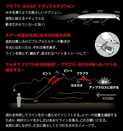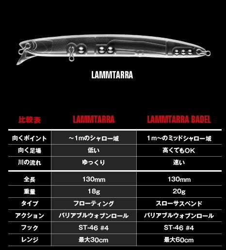 ラムタラのタングステンウェイトチューンモデル。アクションを若干押さえて、潜行深度も60cmに設計。ラムタラが表層を流す設計に対し、ややレンジが入る仕様のバデルはバイトをフックアップに持ち込みやすいというメリットも。流速がある場面や場所ではバデルの実績が高いという特徴がある。大潮〜中潮ではバデル、小潮や若潮などの潮廻りではラムタラと、タイドによっての使い分けも良。