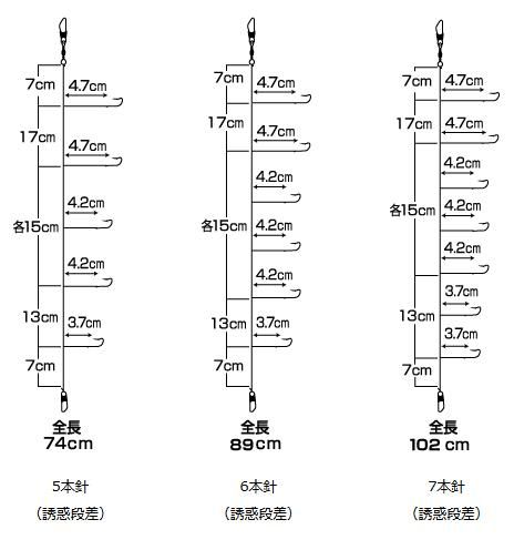 「誘惑段差」シリーズの注目すべき点は、ハリスの長さです。上段4.7cm・中段4.2cm・下段3.7cmとなっています。この段差システムにより、誘いを掛けるとハリスの動きが不規則となり、食い渋ったワカサギを誘惑し食わせます。また、仕掛け上のハリ大きなアタリが出やすく、仕掛け下のハリほどアタリが小さくなりやすいが、この段差システムは上から下まで同じようにアタリが出るようハリスの長さを考え設計しました。これにより、小さなアタリから大きなアタリまで違和感なくアタリを捕らえる事が可能となりました。仕掛けの長さも3種類。狭いドーム船や、屋形船は5本74cmと、6本89cmがオススメです。ボート釣りや氷上の広いテント内では7本102cmで攻めると良いでしょう。