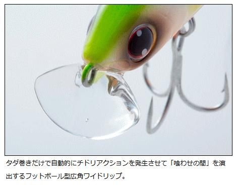 ショートリップモデルは、強い水押しを生む「広角ワイドリップ」を採用により、キレキレのワイドウォブンロールアクションを発生。ただ巻きひとつで激濁りやサラシの中でも1サイズ上のミノーに匹敵するアピール力で魚を誘き寄せる。