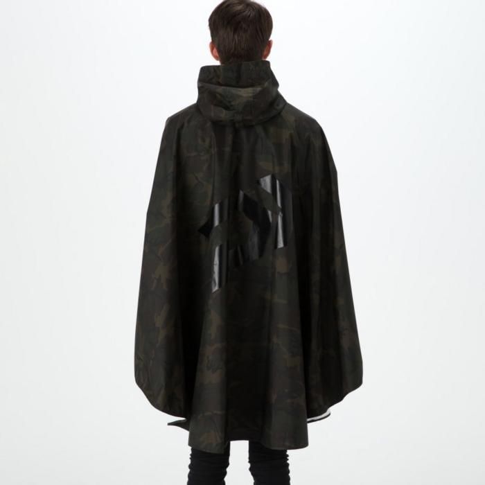 釣行中の急な雨や移動中に素早く羽織ることが可能な防水ポンチョ。軽く風合いの柔らかいレインマックスR2層生地にトップコート加工を施し強度をUP。左右の腕に配置したスナップボタンを留めて、袖のような仕様にできるほか、フロントは軽量で防水性に優れた止水ファスナーを採用。背面に大きなロゴプリントを配しフィールドで目を惹くデザイン。