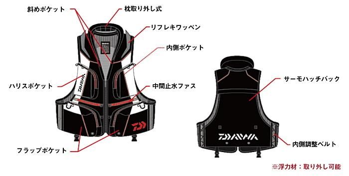 バリアテック(R) 透湿防風素材採用。枕を着脱することで、幅広い季節、シチュエーションに対応可能。各箇所に搭載したポケットは、使い方を想定し最適な位置に配置。背中の蒸れを軽減するサーモハッチバックシステム。弾性に優れた浮力材を採用し、ストレス無く釣りに集中できる優れた快適性を実現。