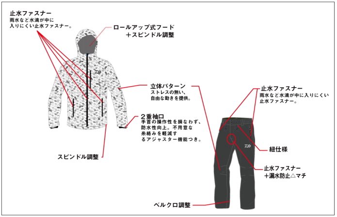 ・あらゆるフィールドで使用可能な全天候型のレインスーツ。