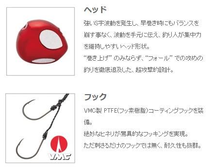 リトリーブ、フォール時に強いS字波動を生み出す事で、高活性でその波動を好む真鯛はもちろん、それを嫌う真鯛にも「威嚇」もしくは「攻撃系」バイトを誘発。