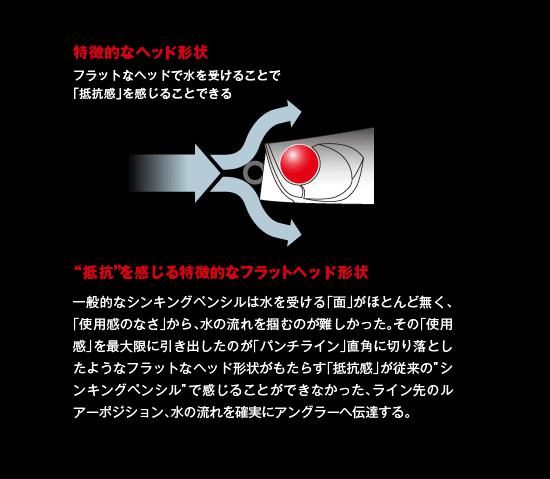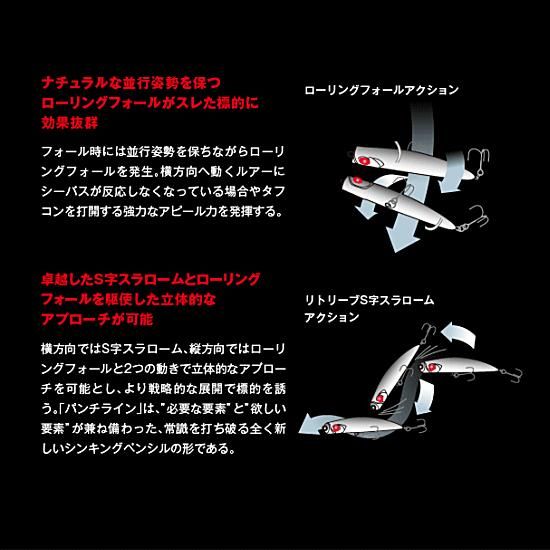 ベイトは居るもののサイズが小さい時、盛んにボイルを繰り返すもパターンにハマらない時はスリムが功を奏す事も多い。表層系のマイクロベイトパターンやバチパターンなどに対応すべく、振幅の小さなロールアクションを持たせている。フォール速度は無負荷で約3.5秒/1mほどに設定(*)。これにより底層を泳ぐターゲットも落ちてくるルアーに対して反応し易く、食わせの間を多く作る事が出来る。*淡水、水温20度