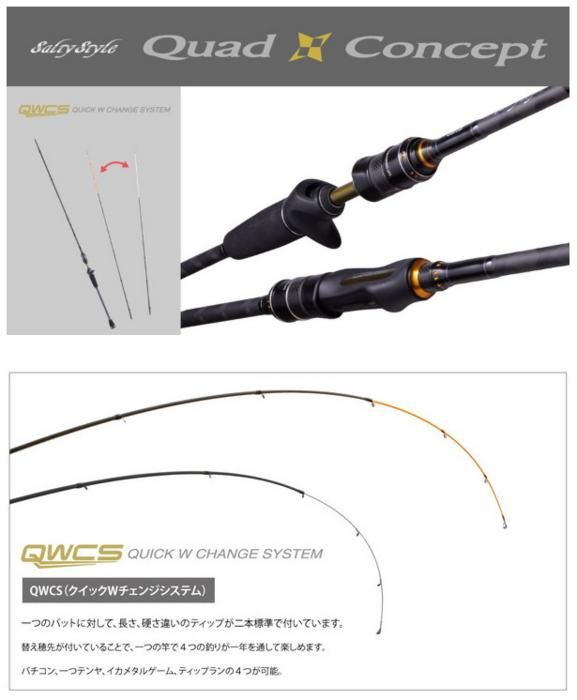 ●QWCS(クイックWチェンジシステム):替え穂先が付いていることで、一つの竿で4つの釣りが一年を通して楽しめます。バチコン、一つテンヤ、イカメタルゲーム、ティップランの4つが可能。