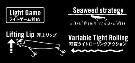 メバルを中心にクロダイなどのライトゲームやマイクロベイトパターンのシーバスゲームに。巻くと浮き上がる浮上設計で、ウィードやゴロタ周辺に潜むターゲットにも積極的にアプローチ。表層引き波のティザー効果を発揮し、フィッシュイーターへ強烈にアピール。巻いて寄せる、止めて食わせるなど様々なパターンを楽しめる。シミーフォールでも緩やかにロールを発動しバイトのチャンスを拡大。ジグヘッドリグやフローティングミノーでは攻略が難しい沖の表層攻略にも。