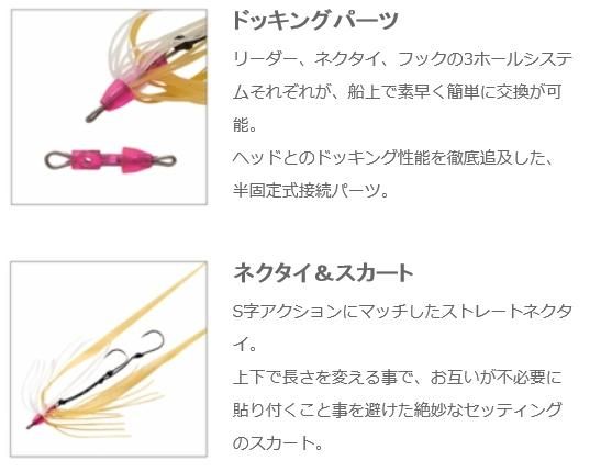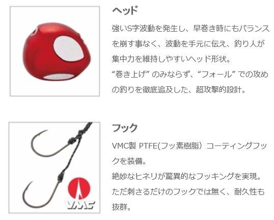 リトリーブ、フォール時に強いS字波動を生み出す事で、高活性でその波動を好む真鯛はもちろん、それを嫌う真鯛にも「威嚇」もしくは「攻撃系」バイトを誘発。