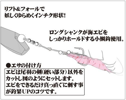 リフト&フォールで妖しくゆらめくインチク形状。ロングシャンクが海エビをしっかりホールドする小鯛鈎を使用しています。ヘッドとフックを遊動にする事により、フックUP後の鯛特有の首振りによるバラシを激減。またフォール中にバイトしてきた鯛に違和感を与えず喰い込ませる事を可能にしました。