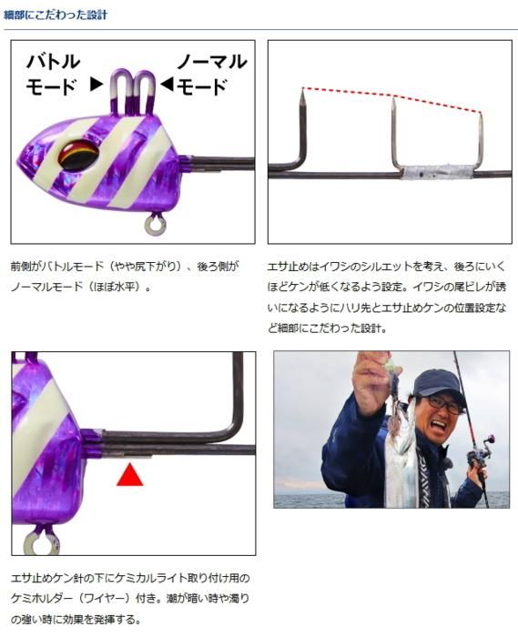 「テンヤのタチウオはエサ釣りとルアー釣りの両方の側面を持っていますが、食わせるよりも引っ掛ける要素の強い釣りです。つまりハリの掛かりの良さが超過を左右するのです。」と宮澤幸則は言う。「快適船タチウオテンヤSS」は、現在考えられる全ての要素を盛り込んだ新兵器。「ハリはサクサスを使用して抜群の掛かりを実現しています。ハリ先を長めに研いであるので、軽いアワセでも掛かるようになっています。」さらに画期的な機能も搭載。「アイを2箇所にすることで攻め方が変えられます。後ろ側がノーマルモードで、前側がバトルモード。ノーマルモードがスロー巻きした時に水中で水平姿勢になるのに対し、バトルモードはテンヤの姿勢が若干立ち気味になり、ハリ先がタチウオに近づくため、活性がよい時はさらに掛かりやすくなるのです。」
