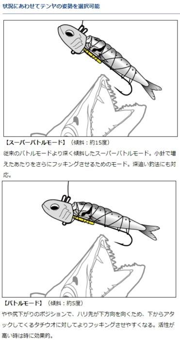 快適船タチウオテンヤSSに早掛けスペシャル登場。宮澤テスター、西村テスターによるスペシャルチューニングされたモデル。針を小さくすることでバイト数がアップ、また小針にすることで針軸が細くなりタチウオの刺さりが格段にアップ。針自体のシルエットが小さくなったことでタチウオに針を飲ませることも可能になり、掛けと飲ませんが両立した設計。