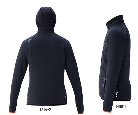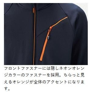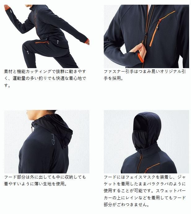 ●軽量で高いストレッチ性能を持った素材を使用し、ミドラーとして着まわしやすいアイテムです。●素材が持つストレッチ性能で体にフィットし、人間の動作で発生する様々な動きに対応。●袖口はバインダーテープを使用し、手首にフィットし重ね着をした際にもごわつきません。袖口には簡易のハンドウォーマーにもできるサムホール付き。●素材と機能カッティングで抜群に動きやすく、運動量の多い釣りでも快適な着心地です。●フード部分は外に出しても中に収納しても着やすいように薄い生地を使用。●フードにはフェイスマスクを装着し、ジャケットを着用したままバラクラバのように使用することが可能です。スウェットパーカーの上にレインなどを着用してもフード部分がごわつきません。●フロントファスナーには隠しネオンオレンジカラーのファスナーを採用。ちらっと見えるオレンジが全体のアクセントになります。●ファスナー引手はつまみ易いオリジナル引手を採用。●首元をファスナースライダーから守るチンガードを採用。●アクセントにもなる胸ポケットを採用。