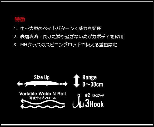 濱本国彦監修。表層をフラフラと泳ぎ、捕食ターゲットとして認識させる弱々しいアクションを持つビッグミノー。水流に身をゆだねるラムタラのコンセプトを踏襲し、表層を流せばティザーとなるV字波紋を発生させ、設定レンジである30cmを泳がせれば緩やかなウォブンロールを発動させる。ハイアピールとローアピールを共棲させ、様々なメソッドでランカーを攻略。体高のあるビッグベイトとは違い、その形状やルアー重量・移動重心システムを搭載する事でタックルの使用範囲を拡大。最高技術の生産ラインを誇るメガバス社の開発力と現場志向のアピアが放つ強烈な一手が、通常では成し得ない「giant-killing」を果たす。
