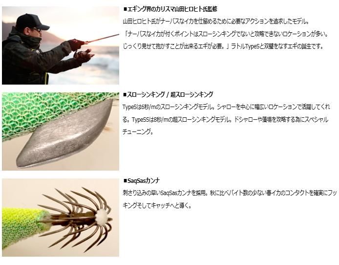 定番エギ「エメラルダスダートII」のスローシンキングモデルをエギング界のカリスマ山田ヒロヒトが徹底監修。目指したのは、スタンダードなフォールスピードでは攻めきれないポイントを攻めることが出来るエギ。ラトル入り・バランス重視型のラトルTypeSと双璧をなす、ノンラトル・ダート特化型のダートII TypeS/SSを追加することでナーバスなイカを戦略的に攻略します。