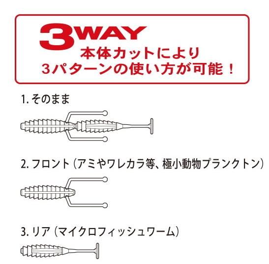 またこのワームは、ひと粒で3度美味しいバリュアブルなアイテムになっています。そのままでの使用はもちろんのこと、フロントとリアをカットすることでそれぞれマイクロワームとしての使用が可能です。