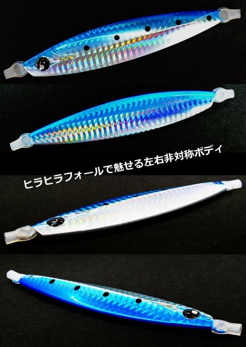 左右非対称のセンターバランスジグ。操作性に優れており、軽いシャクリでもしっかりと動かすことができます。初動方向転換のフォブリングアクションとヒラヒラと落ちるフォールアクションでアピールして、あらゆる魚種に対応します。