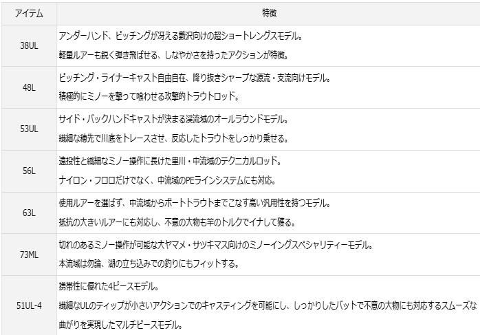 “ストリームトゥイッチャー”は源流〜中流域のピンポイントを狙い撃つ正確なキャスティング性能とミノーを中心としたルアーを積極的にアクションさせながら思い通りのラインにトレースしてネイティブトラウトを誘うロッド操作性に優れたトラウトロッドシリーズ。河川規模、使用ルアーを想定することは勿論、多用するキャスティングスタイルまで考慮してアクションの選定を行っている。こだわりのアイテム構成。